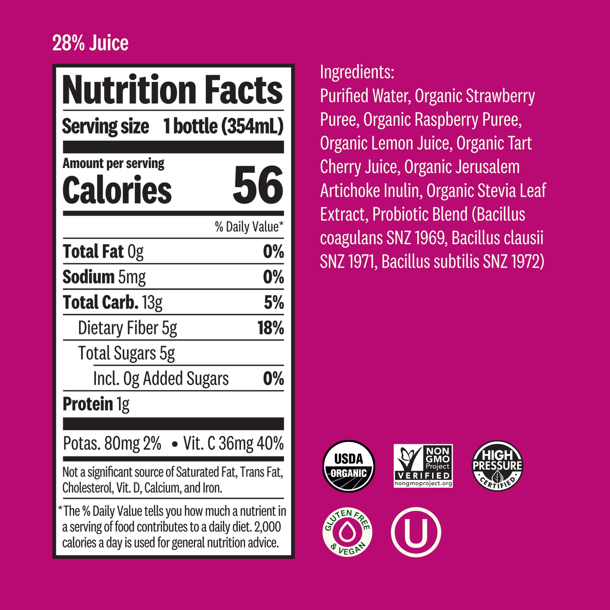 Purified Water, Organic Strawberry Puree, Organic Raspberry Puree, Organic Lemon Juice, Organic Tart Cherry Juice, Or... View product for full ingredients
