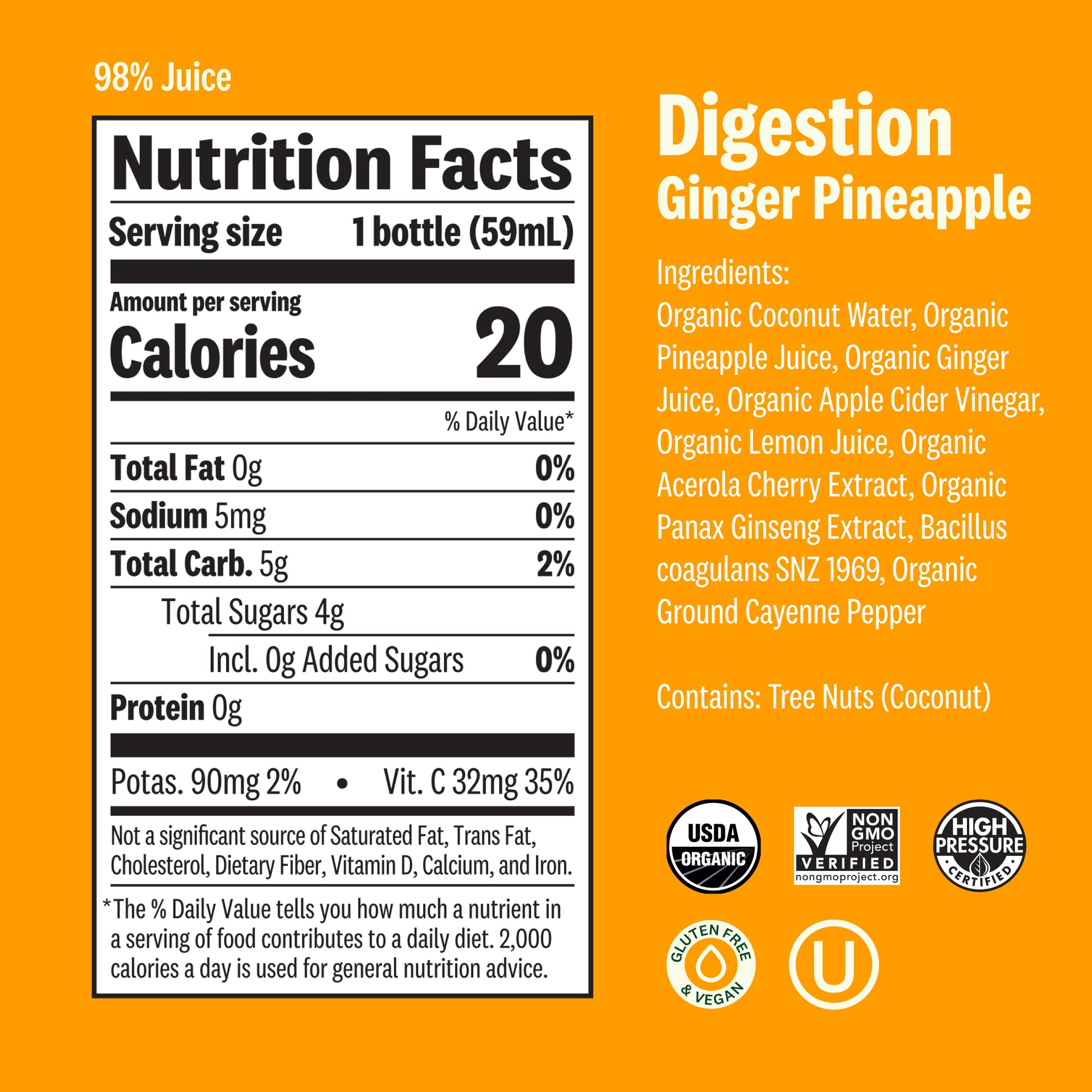 Organic Coconut Water, Organic Pineapple Juice, Organic Ginger Juice, Organic Apple Cider Vinegar, Organic Lemon Juic... View product for full ingredients