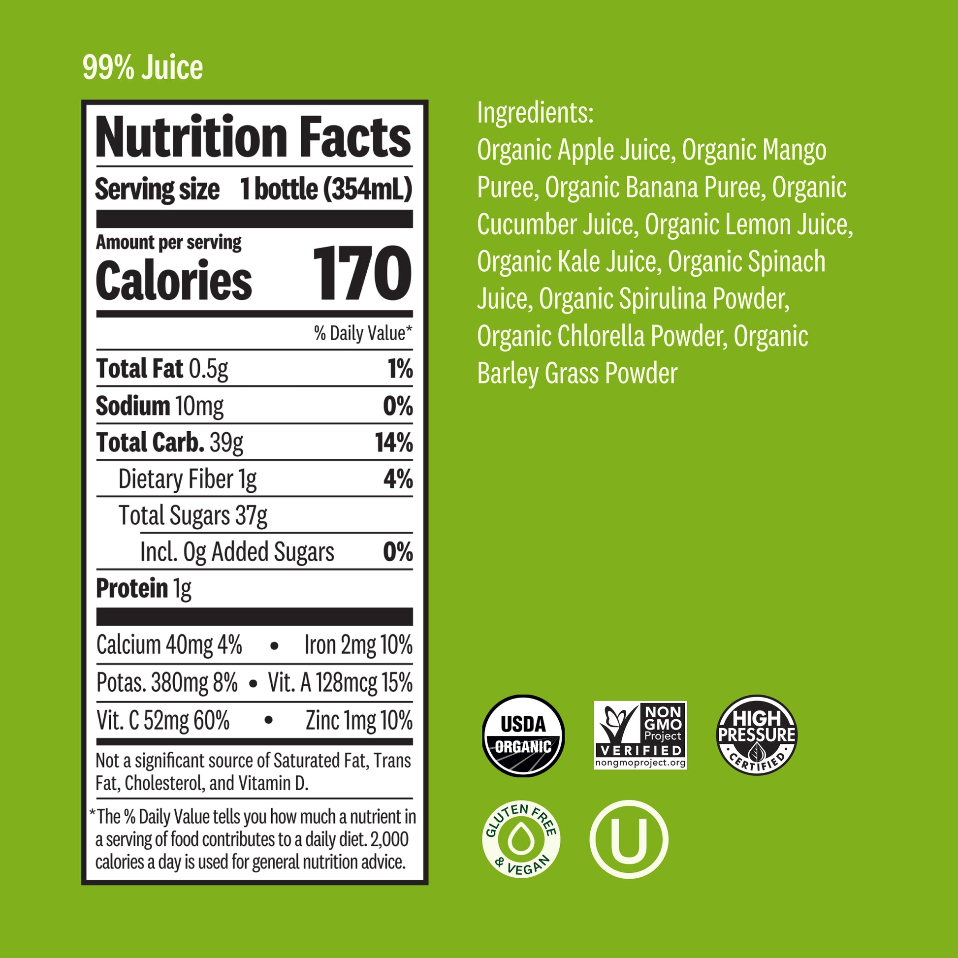 Organic Apple Juice, Organic Mango Puree, Organic Banana Puree, Organic Cucumber Juice, Organic Lemon Juice, Organic Kale Juice, Organic Spinach Juice, Organic Spirulina Powder, Organic Chlorella Powder, Organic Barley Grass Powder Read Less